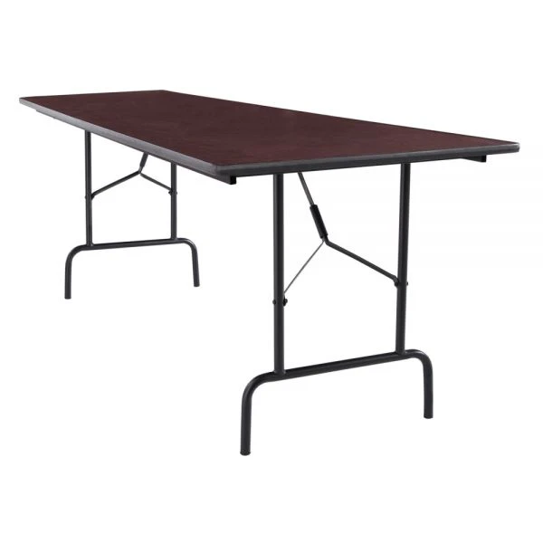 - Realspace folding table is 8′ wide (29″H x 96″W x 30″D) with a walnut finish.