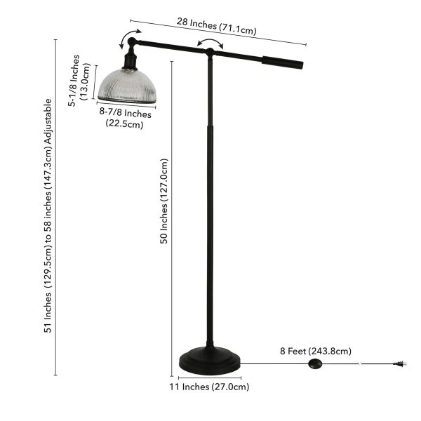 Frenkel 58″ Tall Floor Lamp with Ribbed Glass Shade in Blackened Bronze/Clear – Inspired by modern farmhouse design, this height-adjustable floor lamp features a clean metal body culminating into a dome shade made from ribbed glass. Its adjustable swing arm and lamp head allow you to cast light where you need it most. Use it as a reading light or task light in your living room, bedroom or office and watch how it transforms the space!