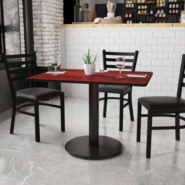 Graniss 30” x 42” Rectangular Mahogany Laminate Table Top with 24” Round Table Height Base – Complete your restaurant, break room or cafeteria with this table top and base configuration. This set is designed for commercial use to withstand the daily rigors in the hospitality industry. This set will also make a great option for your home as a dining table or in the rec room. The reversible black or mahogany top allows you to choose your color of choice and then affix to the base. Surface is heat, scratch and moisture resistant. Use a mild detergent and water, dry clean to keep your tables spotless. Whether you are just starting your business or upgrading your furniture this table set will complete the look.
