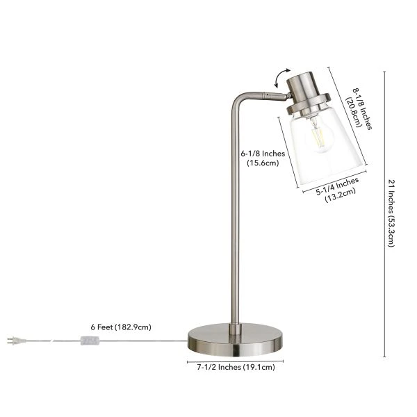 Granville 21″ Tall Table Lamp with Glass Shade in Brushed Nickel/Clear – Elevate your reading nook or home office set-up with this sleek update on a traditional design. This task lamp’s slender neck is gently arched and capped by an adjustable capped cone glass shade. Finished in a warm neutral metallic tone, this fixture will add polished contemporary style in any room of your home.