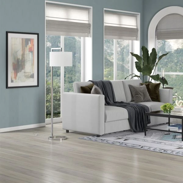 Grayson 64″ Tall Floor Lamp with Fabric Shade in Polished Nickel/White – This timeless floor lamp is the perfect addition to your living room area. Designed to warm up your space with the soft lines of a round shade and round base, this premium metal standing lamp stands at 64″ tall. It’s minimalist lines and warm neutral finishes blend seamlessly with any decor style or color scheme.