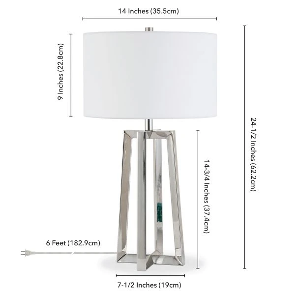 Helena 24.5″ Tall Table Lamp with Fabric Shade in Polished Nickel/White – This elegant table lamp exudes chic style as it illuminates your space. Its simple geometric base brings understated glamour to any room, while its simplistic neutral-hued drum shade tones down its bold base for a balanced look. This lovely luminary brightens any room perfectly.