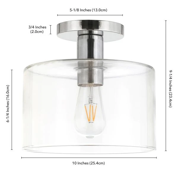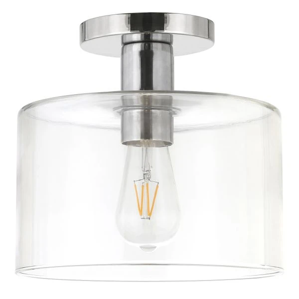 Henri 10″ Wide Semi Flush Mount with Glass Shade in Polished Nickel/Clear – With a style inspired by the industrial revolution but appropriate for a coastal beach house, this semi flush mount ceiling light brings true mood lighting to your space. The classic glass drum shade and streamlined hardware gives this fixture a retro feel that complements many decor styles. The on-trend metallic finish provides a perfect complement to nearly any color scheme.