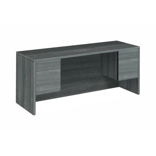 HON 10500 Series Box/File Credenza with Kneespace – Kneespace credenza with 3/4 pedestal is part of HON 10500 Series Wood Laminate Desking that offers practical functionality and uncompromising durability. Durable, 1-1/8″ solid-core, high-performance particleboard resists warping. Laminate is scratch-resistant, stain-resistant and spill-resistant. Credenza features one box and one file drawer in each pedestal. Drawers lock and offer five-sided construction for easy drawer alignment or replacement of drawer fronts. Interchangeable, core-removable lock makes rekeying quick and easy. Box drawers operate on ball-bearing suspension with 3/4 extension while the file drawers extend fully on ball-bearing suspension. Included hangrails are designed for side-to-side, letter-size or legal-size filing and front-to-back letter-size filing. Formal, full-height modesty panel features one-cord, pass-through the grommet in the top center for easy access to wall electrical outlets. Credenza is not designed to be used with modular or mobile pedestals.