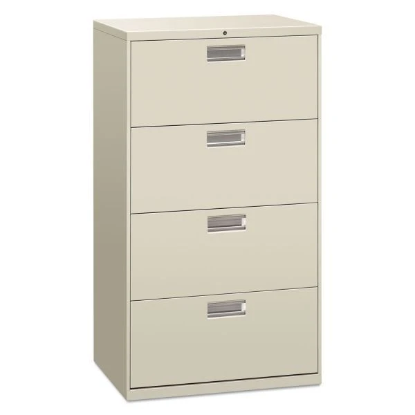 HON 600 Series Four-Drawer Lateral File, Letter/Legal/A4, 30w x 18d, Light Gray – HON Brigade 600 Series lateral files are engineered for high-activity filing and retrieval in corporations, educational institutions, hospitals, and government offices. The rugged inner steel grid stands up to years of rigorous use. Most models feature standard drawers, and select models have receding doors with roll-out shelves. Heavy-duty ball-bearing suspensions are tested to simulate decades of use and still perform flawlessly. The mechanical interlock inhibits more than one drawer from opening at a time. Counterweights are factory-installed where required to maintain stability when a drawer is opened, and made from recycled material. Side-to-side hangrails for letter or legal filing are standard, and optional front-to-back hangrails can be ordered for high-density letter filing on some cabinets. All four leveling glides can be adjusted even when drawers are full. Removable lock cores can be changed on location.
