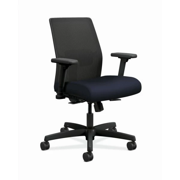 HON Ignition Mesh Task Chair – No matter who you are, how you work or where you work, Ignition seating from HON fits. This mesh-back task chair delivers style, customizable control and advanced features. Breathable, four-way stretch mesh back cradles your spine with natural lumbar support and increases airflow. Synchro-tilt control mechanism with seat slider reclines the back and seat in the perfect ratio to give you a natural posture whether sitting upright or leaning back. Height-adjustable, width-adjustable arms and an adjustable lumbar support provide a custom fit. Other functions include pneumatic seat-height adjustment from 17″ to 21″ , 360-degree swivel, tilt tension and tilt lock. The 30″ diameter five-star base is equipped with hard dual-wheel casters. Task chair also offers navy fabric upholstery on the cushioned seat and a black frame. 19″ wide seat provides a usable seat depth from 16″ to 18″. Back size is 18″ wide x 26″ high. Weight capacity is 300 lb.