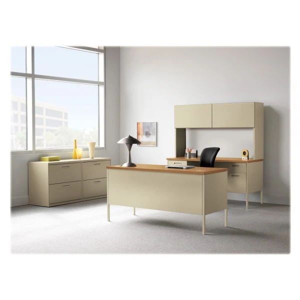 HON Metro Classic Series Workstation Return, Left, 42w x 24d x 29.5h, Harvest/Putty – When people picture the definitive steel desk, what they see is Metro Classic from HON. This retro-styled collection features up-to-date amenities and best-in-class construction. The square tubular steel legs are painted to match the body, and the molded polymer handles are sculpted to match HON 500 Series lateral files. The top surface is easy-care laminate that’s scratch-, spill- and stain-resistant. The drawers feature Tru-Fit mitered fronts that align perfectly to the desk when closed. Central locking opens all drawers with the turn of a single key. In addition, every component has built-in wire management, and all desks and credenzas can be outfitted with stack-on hutches. Metro Classic looks back on great style, and looks forward to great performance.