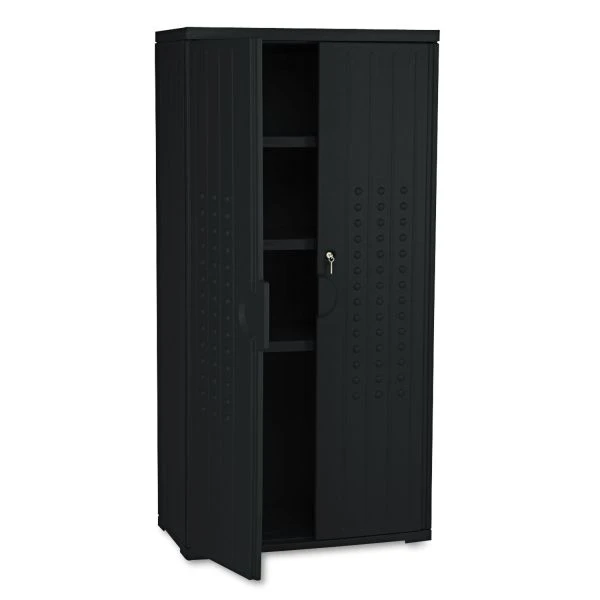 Iceberg Rough n Ready Storage Cabinet, Three-Shelf, 33w x 18d x 66h, Black – Cabinet offers lockable doors for security and double walls for stability. Generous storage capacity holds equipment, books, binders or office supplies. Storage cabinet is made of durable, dent-resistant, scratch-resistant blow-molded, high-density polyethylene. Material is easy to clean and resistant to chemicals.