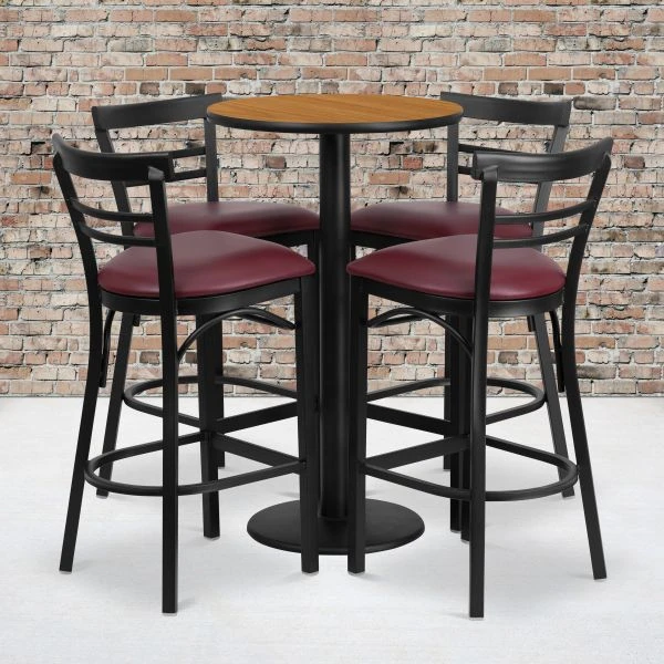 Jamie 24” Round Natural Laminate Table Set with Round Base and 4 Two-Slat Ladder Back Metal Barstools – Burgundy Vinyl Seat – Don’t have time to search through hundreds or thousands of table and seating options? This complete Bar Height Table and Stool set saves you time to focus on your growing business. This set includes an elegant Natural Laminate Table Top, Round Base and 4 Metal Ladder Back Barstools. Surface is heat, scratch and moisture resistant. Easily clean using a mild detergent and water, dry clean to keep your tables spotless. Use this setup in sports bars, banquet halls, restaurants, break room/cafeteria settings or any other social gathering. Mix in bar height tables with standard height tables for a more varied seating selection. Whether you are just starting your business or upgrading your home or business furniture this restaurant quality bar table set will round out your dining space.