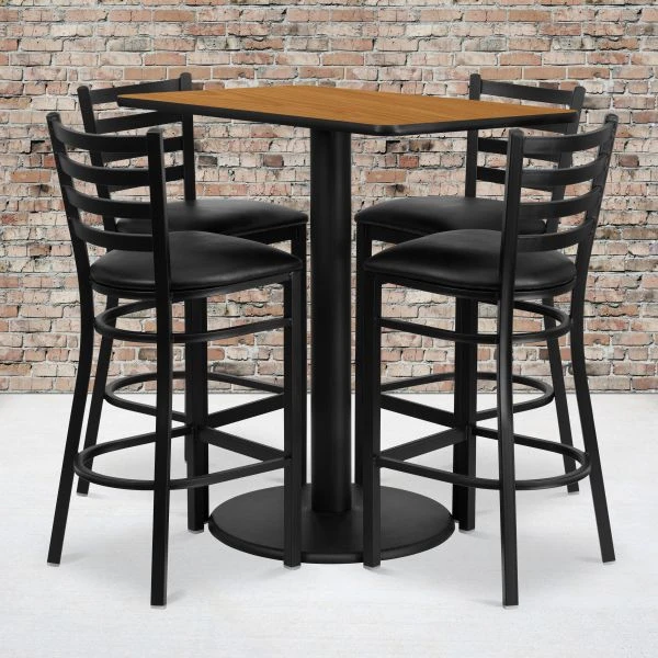 Jamie 24” x 42” Rectangular Natural Laminate Table Set with 4 Ladder Back Metal Barstools – Black Vinyl Seat – Don’t have time to search through hundreds or thousands of table and seating options? This complete Bar Height Table and Stool set saves you time to focus on your growing business. This set includes an elegant Natural Laminate Table Top, Round Base and 4 Metal Ladder Back Barstools. Surface is heat, scratch and moisture resistant. Easily clean using a mild detergent and water, dry clean to keep your tables spotless. Use this setup in sports bars, banquet halls, restaurants, break room/cafeteria settings or any other social gathering. Mix in bar height tables with standard height tables for a more varied seating selection. Whether you are just starting your business or upgrading your home or business furniture this restaurant quality bar table set will round out your dining space.