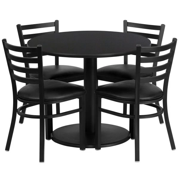 Jamie 36” Round Black Laminate Table Set with Round Base and 4 Ladder Back Metal Chairs – Black Vinyl Seat – Don’t have time to search through hundreds or thousands of table and seating options? This complete Banquet Table and Chair set saves you time to focus on your growing business. This set includes an elegant Black Laminate Table Top, Round Base and 4 Metal Ladder Back Chairs. Surface is heat, scratch and moisture resistant. Easily clean using a mild detergent and water, dry clean to keep your tables spotless. Use this setup in banquet halls, wedding ceremonies, hotel conferences, restaurants, break room/cafeteria settings or any other social gathering. The lightweight designer metal chair will enhance any environment. Whether you are just starting your business or upgrading your home or business furniture this restaurant quality table set will round out your dining space.