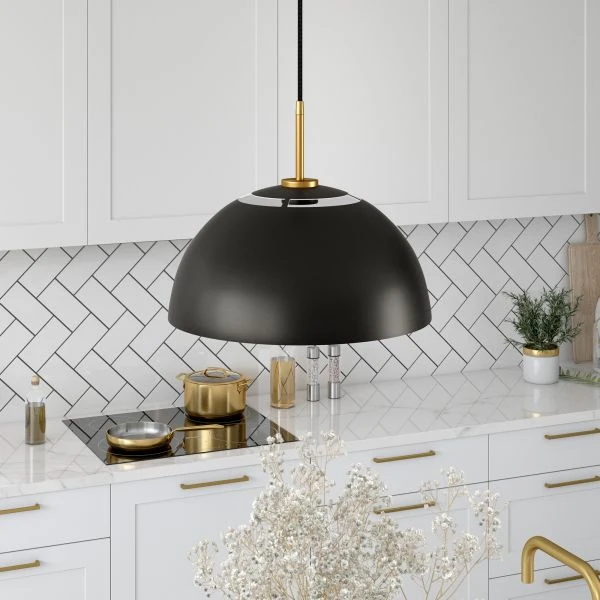 Jordyn 16″ Wide Pendant with Metal Shade in Matte Black/Brushed Brass – Clean lines and a mid-century modern design combine to create this unique pendant light fixture. The 16″ wide round shade features cut-outs along the top so light can reflect up towards your ceiling as well as through the traditional downlight. The adjustable 8 foot cord allows you to hang the pendant at your desired height. Its unique design sets this pendant apart and is sure to be an eye-catching statement piece in your foyer, kitchen, or dining room.
