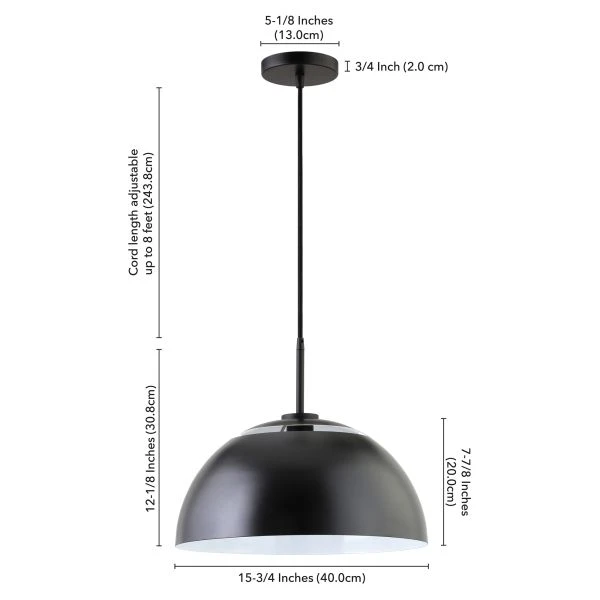 Jordyn 16″ Wide Pendant with Metal Shade in Matte Black – Clean lines and a mid-century modern design combine to create this unique pendant light fixture. The 16″ wide round shade features cut-outs along the top so light can reflect up towards your ceiling as well as through the traditional downlight. The adjustable 8 foot cord allows you to hang the pendant at your desired height. Its unique design sets this pendant apart and is sure to be an eye-catching statement piece in your foyer, kitchen, or dining room.