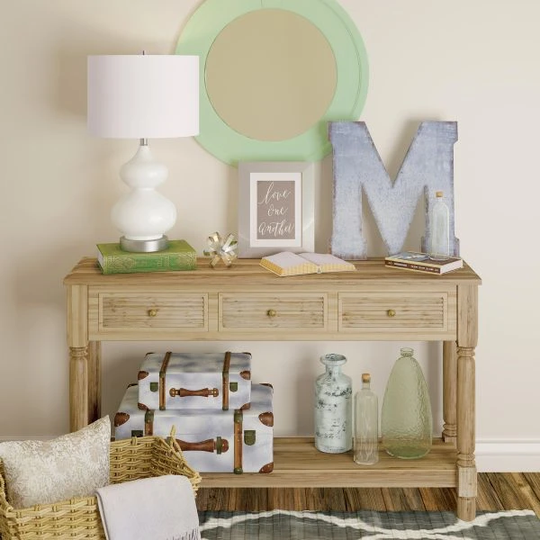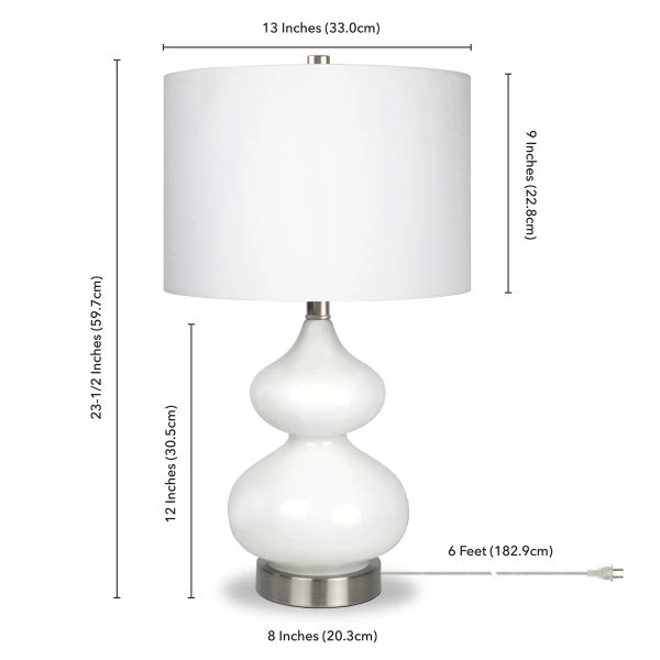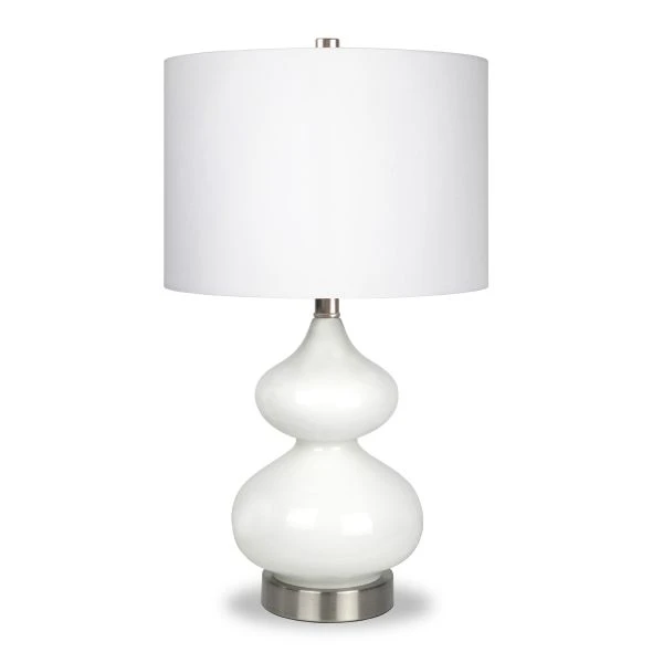 Katrina 23.5″ Tall Table Lamp with Fabric Shade in White Glass/Satin Nickel/White – This lamp features the beautiful and iconic double gourd base. This luminary’s base is crafted of glass finished in a glossy solid hue while its single bulb is highlighted by a linen French drum shade in a crisp chiffon color.