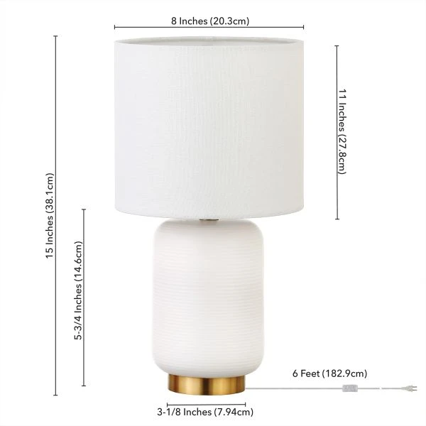 Lambert 15″ Tall Ceramic Mini Lamp with Fabric Shade in Matte White/Brass/White – Bring a touch of retro styling to your bedside, mantle, or hall table with this textural mini accent lamp. The jar-shaped base is made of lightly ribbed ceramic, creating an organic feel to the fixture. Accented with a metal standing ring and a crisp linen shade, this lamp is the perfect piece anywhere you need to shed a little extra light.