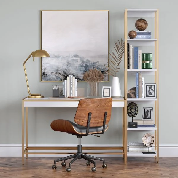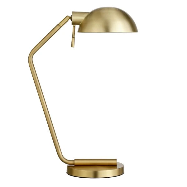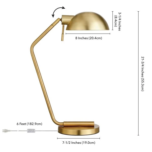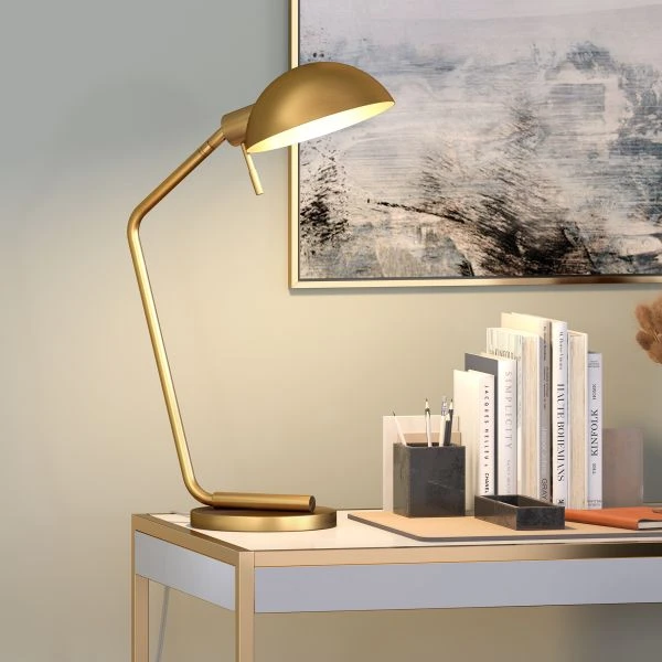 Lamont 20.75″ Tall Table Lamp with Metal Shade in Brass/Brass – Upgrade the lighting of your desk, craft table, or bedside with this modern update of a classic task lamp. The low-profile design features a gently bent neck and domed shade that can be adjusted to cast light at a variety of angles. Finished in a warm neutral metallic tone, this fixture will add subtle retro styling in your reading nook, home office, or bedroom.