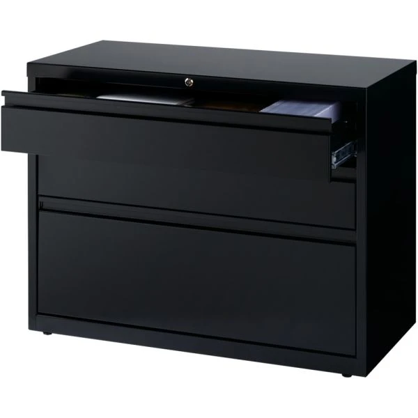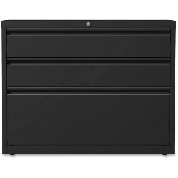 Lorell 3 Drawer Lateral File Cabinet, Letter/Legal/A4, Black – Handy lateral file features three versatile drawers. File drawer includes hanging file rails for side-to-side filing in letter-size, legal-size or A4-size. Box drawers include two dividers for organize your supplies. All three drawers lock with a core-removable lock with dual locking bars. Drawers also feature full-width pulls and ball-bearing slide suspension. Use the included magnetic label holders for easy identification of drawer contents. Interlock system prohibits opening more than one drawer at a time. Counterweight prevents tipping. Steel construction has a baked enamel finish for durability. Lateral file also offers a reinforced base and four adjustable leveling glides to stabilize it on uneven surfaces. Lateral file meets or exceeds ANSI-BIFMA standards