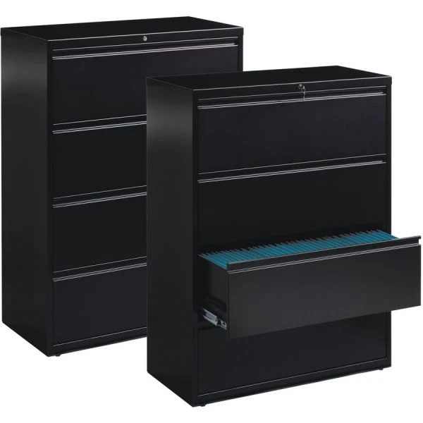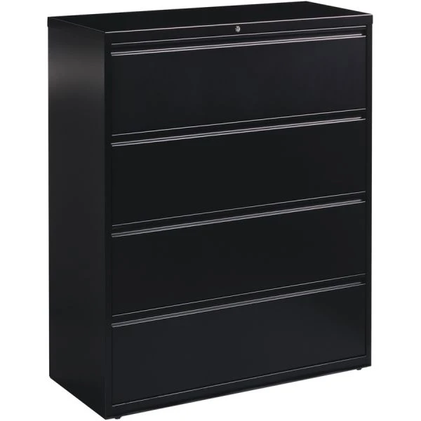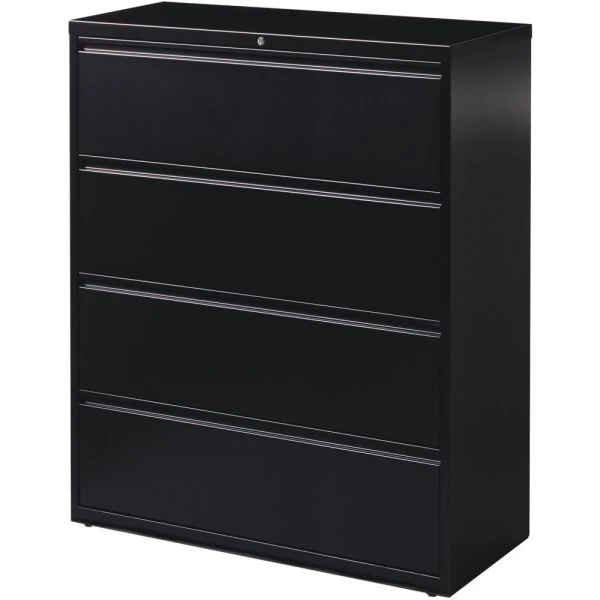 Lorell 4 Drawer Lateral File Cabinet, Letter/Legal/A4, 42″ Wide, Black – 42 wide lateral file features four versatile drawers with hanging file rails for side-to-side filing in letter-size, legal-size or A4-size. Each drawer has a magnetic label holder for easy identification where you need it. Design also features a core-removable lock for security, dual locking bars, full-width pull, ball-bearing slide suspension for smooth opening and closing, reinforced base, and four adjustable leveling guides for stabilization. Interlock system prohibits the extension of more than one drawer at a time for your safety. Counterweight prevents tipping. Lateral file meets or exceeds applicable ANSI/BIFMA standards.