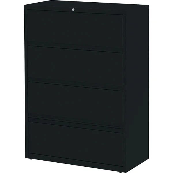 Lorell 4 Drawer Lateral File Cabinet with Roll Out Shelves, Letter/Legal/A4, 36″ Width, Black – Receding lateral file with roll-out shelves offers a total of four drawers with heavy-duty, three-piece, ball-bearing slide suspension for smooth drawer movement. All drawers above the bottom one have receding fronts and roll-out shelves for easy access to your files. Bottom drawer has a fixed front. Included hangrails accommodate side-to-side filing of letter, legal or A4-size folders. Dual lock bars secure both ends of drawers. Interlock system prohibits the extension of more than one drawer at a time. 36 wide lateral file also features a core-removable lock; full-width designer drawer pulls; four adjustable leveling guides for stabilization and reinforced double-base construction. Lateral file does not include dividers. File meets/exceeds applicable ANSI/BIFMA standards.”