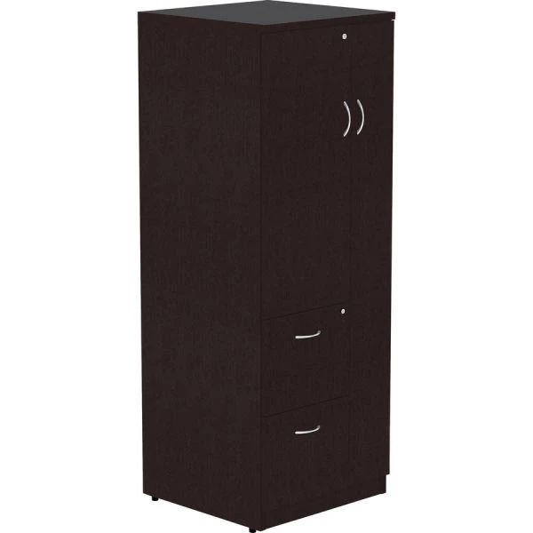 Lorell Essentials Laminate Tall Storage Cabinet – 2-Drawer – Tall storage cabinet can be used with Lorell Essentials or Relevance Series with high-quality laminate construction and metal-to-metal, cam-lock connections. Design of the cabinet expands your storage opportunities with the varied sizes of compartments. Full-length compartment on the right features a door to conceal contents. On the left, the half-length compartment includes a locking door and two shelves. Bottom two drawers lock to secure your belongings and hold letter-size files. Durable, Espresso laminate surfaces provide a professional look and are abrasion-resistant. Back is finished on both sides. Cabinet is made of particleboard and medium-density fiberboard. Adjustable levelers help stabilize the cabinet on uneven surfaces.