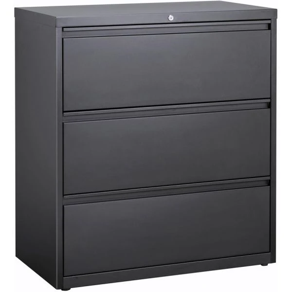 Lorell Hanging File 3 Drawer Lateral File Cabinet, Letter/Legal/A4, 36″ Wide, Charcoal – This 36″ wide lateral file features three versatile drawers with hanging file rails for side-to-side filing of letter-size, legal-size or A4-size folders. Each drawer has a magnetic label holder for easy identification where you need it. Design also features a core-removable lock for security, dual locking bars, full-width pull, ball-bearing slide suspension for smooth opening and closing, reinforced base, and four adjustable leveling guides for stabilization. Interlock system prohibits the extension of more than one drawer at a time for your safety. Counterweight prevents tipping. Lateral file meets or exceeds applicable ANSI/BIFMA standards.