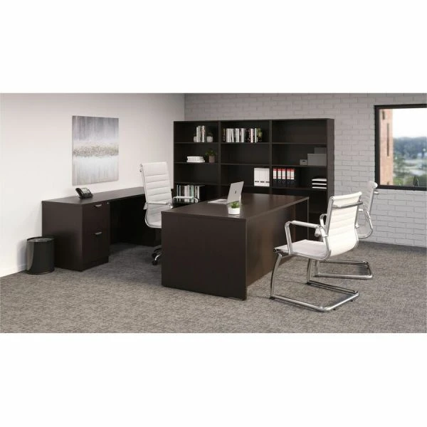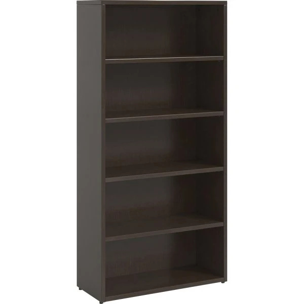 Lorell Prominence Espresso Laminate Bookcase – This five-shelf bookcase is part of the Lorell Prominence 2.0 Series that offers an elegant design perfect for your executive office suites. Durable, Espresso laminate surface is mar-resistant, burn-resistant and impact-resistant to withstand hectic, daily work life. The 1″ thick top features matching 3mm edgebanding. Bookcase is manufactured with 45 lb. density particleboard and finished on both sides with high-performance, thermally fused melamine. Back of the bookcase is finished on both sides. Freestanding bookcase offers five shelves for decor, files, binders, books and more to increase your open storage space and declutter worksurfaces. Four shelves adjust in 1″ increments to easily customize the bookcase for your needs. Spaced evenly, the shelves have a 12-1/2″ space between them. Each shelf can hold 81 lb. The 3/4″ adjustable glides allow the bookcase to remain level on uneven surfaces. Bookcase ships fully assembled so it’s ready for immediate use.