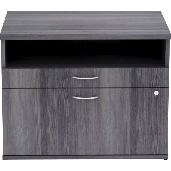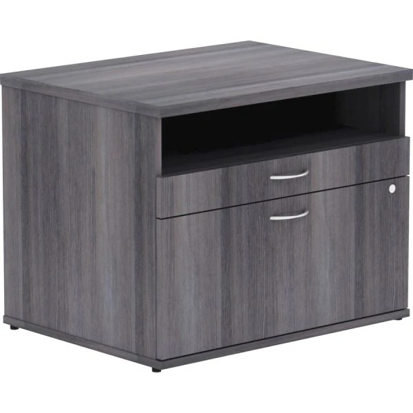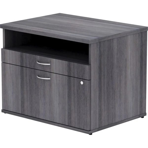 Lorell Relevance Series Charcoal Laminate Office Furniture Credenza – 2-Drawer – File cabinet credenza with open shelf is part of the Lorell Relevance Series, versatile and stylish office furniture that configures to meet your needs. Weathered Charcoal laminate exterior matches other units in the series for a cohesive, professional look. Low cabinet with silver pulls includes an open shelf, supply drawer and lateral file drawer for versatile storage. Adjustable leveling feet help keep the credenza even on uneven surfaces.