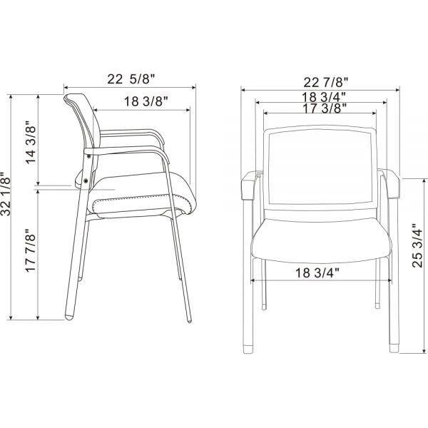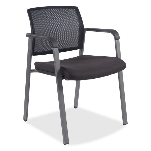 Lorell Stackable Guest Chair – Stackable guest chair features a mesh back to mold to your natural curvature. The exhaust vent in the plastic cover under the fabric-upholstered, cushioned seat offers even more breathability. Nylon pads top the fixed arms that are built into the four square tube legs. Use for your lobby or large meeting areas. Chairs stack up to four high. Seat measures 18-3/4 wide x 18-3/8″ deep x 18-1/8″ high. Back size is 17-3/8″ wide x 14″ high.