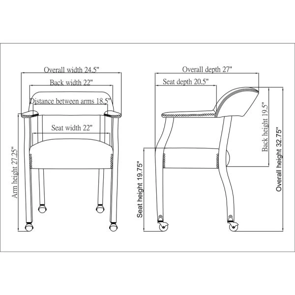 | Marketing Information | Traditional guest chair offers a thick padded seat, wraparound back and elegant heavy-duty oxblood vinyl. Wood frame is made of kiln-dried hardwood lumber that is glued and screwed for durability. Guest chair measures 23" high from top of arms to floor, including casters. Chair rolls easily on four casters. |