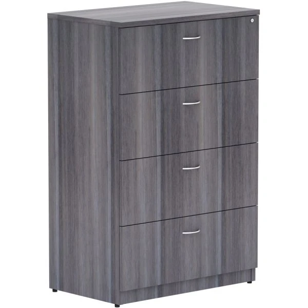 Lorell Weathered Charcoal 4-drawer Lateral File – Four-drawer lateral file is part of Lorell Essentials Series Laminate Furniture with high-quality laminate construction and a contemporary design. Weathered Charcoal laminate top is 1″ thick for durability. File drawer accommodates letter-size and legal-size files with included hangrails. Drawers roll smoothly on steel ball-bearings with full extension. Central locking system locks all drawers at once. Anti-tip feature allows only one drawer to be opened at a time. Design also includes 3mm PVC edges and adjustable levelers for stabilization.
