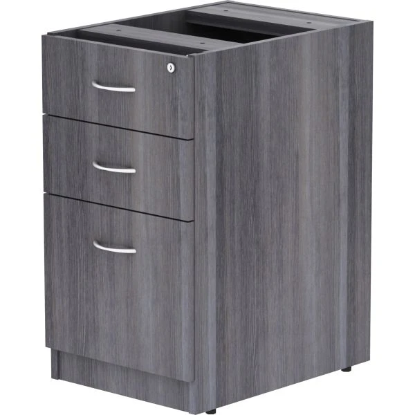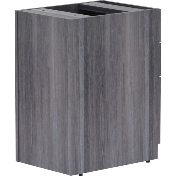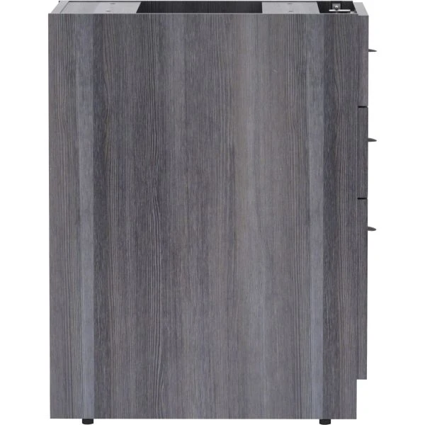 Lorell Weathered Charcoal Laminate Desking Pedestal – Unfinished pedestal is part of Lorell Essentials Series Laminate Furniture with high-quality, Weathered Charcoal laminate construction. Pedestal offers a box/box/file design to store office supplies and important files. The file drawer includes hangrails and holds letter-size and legal-size hanging files. Design also includes 96mm metal drawer pulls with a silver brush finish and 3mm PVC edges. Pedestal should not be used without a top (sold separately). It attaches to the underside of the top of an Essentials Series desk, credenza or return with the included fasteners and extends to the floor. Adjustable floor guides offer stabilization.