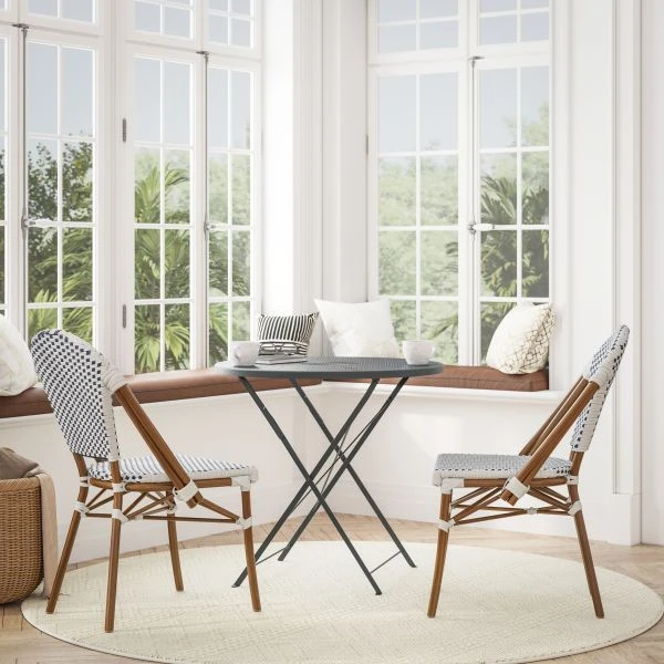 Lourdes Indoor/Outdoor Commercial French Bistro Stacking Chair, White and Navy PE Rattan Back and Seat, Bamboo Print Aluminum Frame in Natural – Bring the street vibes of Paris right into your restaurant, bistro, hotel, or backyard patio with this indoor/outdoor commercial grade French bistro chair. The durable PE rattan back and seat are very comfortable and won’t fade when used outdoors. The lightweight, but sturdy, powder coated aluminum frame boasts a bamboo look finish, holds up to 400 lbs. static weight, and will not rust. Recommended stack height for these chairs is up to 5 high for storage or transport. For your convenience, this chair arrives completely assembled for instant use and features floor protector glides to prevent damage to indoor hard flooring surfaces. This dining chair easily wipes clean with a damp cloth for quick seating turnaround.