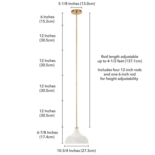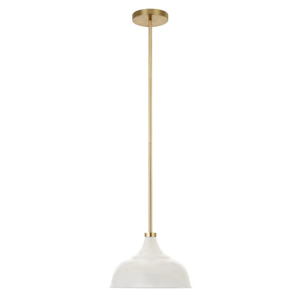 Mackenzie 10.75″ Wide Pendant with Metal Shade in Matte White/Brass/Matte White – Vintage factory-style lighting gets a modern update with the classic silhouette of this pendant light. The elegant minimalism of its softly curved dome allows this fixture to blend seamlessly with many décor styles. Add a touch of industrial appeal to your living room, dining room, kitchen, or foyer with a range of handcrafted shade colors, offset by a metallic adjustable down rod.