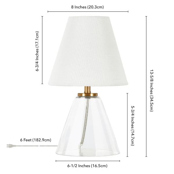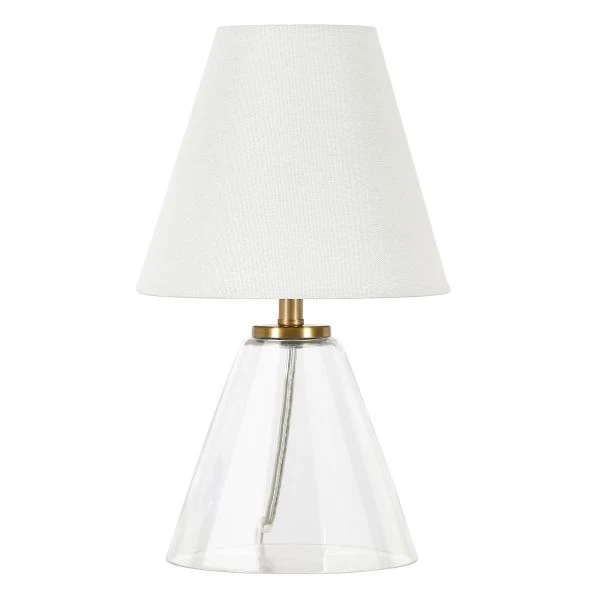 Makenna 13.62″ Tall Mini Lamp with Fabric Shade in Clear Glass/White – Illuminate your bedside, mantle, or hall table in traditional style with this classic yet eye-catching mini accent lamp. The brass-accented conical base is made of clear glass, letting your color scheme take the lead. With a gently tapered linen shade that mirrors the curves of the base, this lamp is the perfect piece anywhere you need to shed a little extra light.