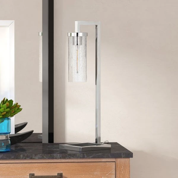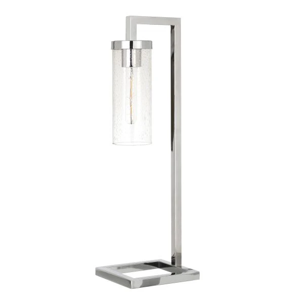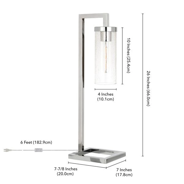 Malva 26″ Tall Table Lamp with Glass Shade in Polished Nickel/Seeded – Illuminate your space is clean, modern style with this 26″ desk lamp. Crafted of steel in a neutral metallic finish, this lamp strikes a clean-lined hook-shaped silhouette on an open square base. Suspended from its arced top, a glass cylinder shade diffuses ambient light as it’s dispersed throughout your space. Powered by a 72″ electric cord, this floor lamp is operated by a simple on/off switch.