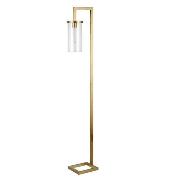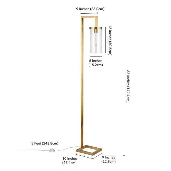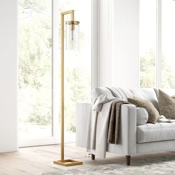 Malva 67.75″ Tall Floor Lamp with Glass Shade in Brass/Seeded – Illuminate your space is clean, modern style with this versatile floor lamp. Crafted of steel in a neutral metallic finish, this lamp strikes a clean-lined hook-shaped silhouette on an open square base. Suspended from its arced top, a glass cylinder shade diffuses ambient light as it’s dispersed throughout your space.