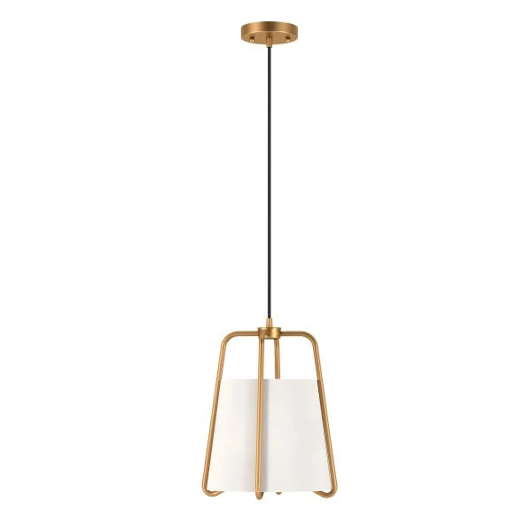 Marduk 11″ Wide Pendant with Fabric Shade in Brass/White – White fabric shade with 1 light. The shade’s warm glow contrasts with the stark simplicity of its outer metal frame. This contemporary fixture, with an adjustable height, would complement the modern design of your living room, dining room, bedroom or foyer.