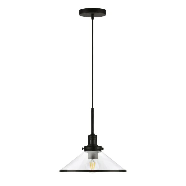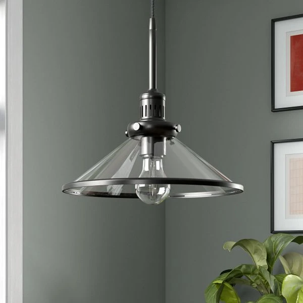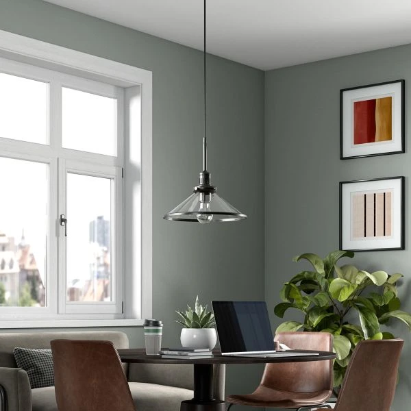 Milo 12.25″ Wide Pendant with Glass Shade in Blackened Bronze/Clear – Featuring a cone-shaped glass shade, rimmed with a black band, this pendant light is perfect for illuminating your entryway, dining room or kitchen island. Modern-inspired design is seamlessly used from the hanging fixture down to the sleek blackened bronze accents along the rim of the glass shade.