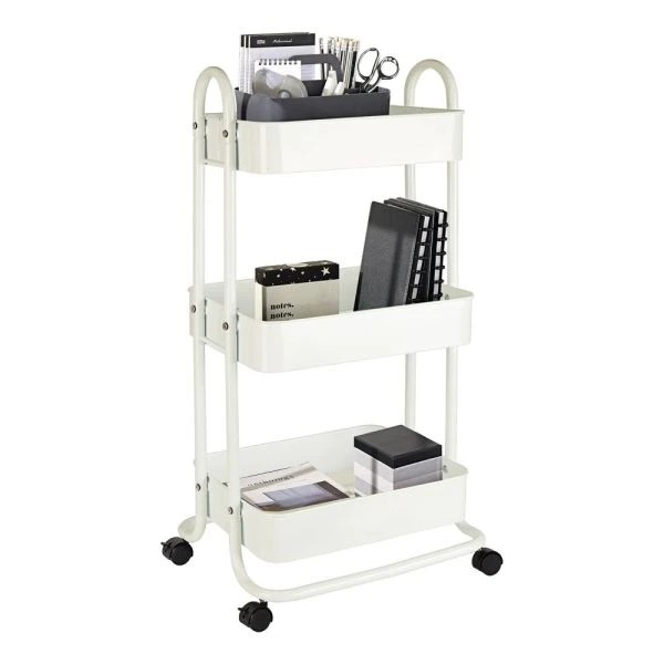 Mobile 3-Tier Storage Cart, 35-5/8″H x 17-15/16″W x 14-5/16″D, Off-White – Keep office supplies, craft materials and paperwork neatly organized on the Realspace Mobile 3-Tier Storage Cart. Easily maneuver this cart throughout your home with steering handles and lockable casters.