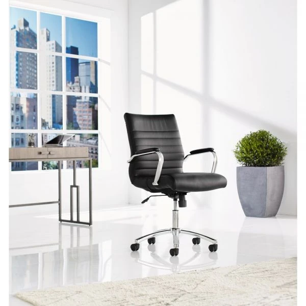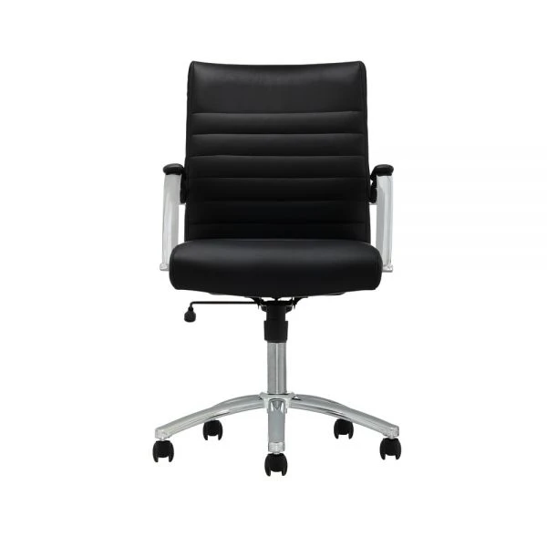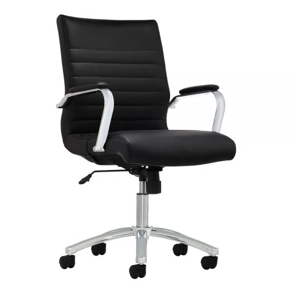 Modern Comfort Winsley Bonded Leather Mid-Back Manager’s Chair, Black/Silver, BIFMA Certified – Furnish your workstation with this Realspace Modern Comfort Winsley mid-back bonded leather chair. The metal frame offers sturdy support, while the lumbar support promotes an upright posture and strain relief. Pneumatic seat-height adjustment and tilt lock let you effortlessly customize your seating position. This Realspace Modern Comfort Winsley mid-back chair features rolling casters for seamless maneuvering and bonded leather upholstery for easy cleanup.