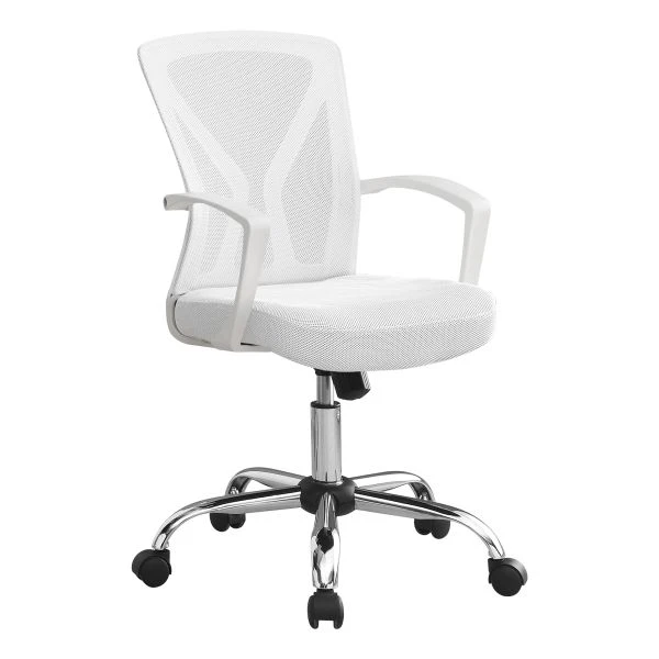 Office Chair, Adjustable Height, Swivel, Ergonomic, Armrests, Computer Desk, Work, White Mesh, Chrome Metal, Contemporary, Modern – This mid-back office chair with fixed armrests in white has your back if you need a supportive, comfortable, and stylish desk chair. The backrest has a curved, ergonomic shape that promotes good posture. The seat is deep and extra wide with generous padding to offer a roomy feel. White mesh fabric that allows air to circulate covers the swivel seat and backrest. The backrest exterior features supports that are both decorative and functional. These supports add visual interest and can be used as handles when you move this adjustable-height chair that has a 5-star base finished in chrome, with black casters for mobility. Ideal for smaller spaces, this chair will bring streamlined style to your office.