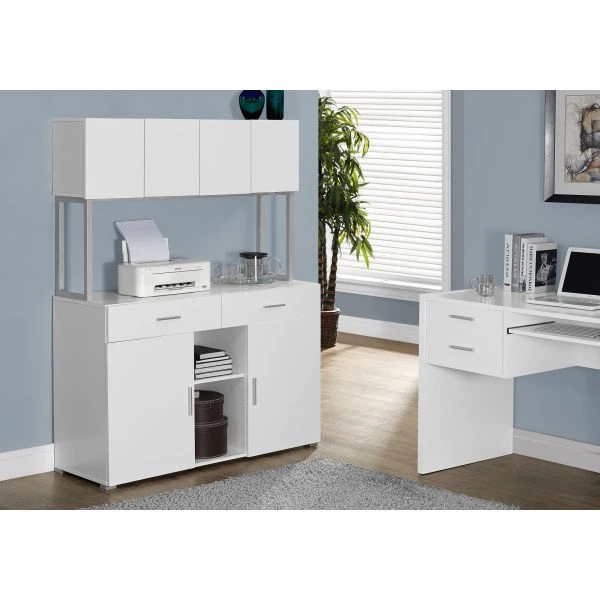 Storage, Drawers, File, Office, Work, White Laminate, Grey Metal, Contemporary, Modern – Stylish and functional, this chic white storage credenza finished on all sides, adds modern appeal to a home office. Thick paneled and durable, this office cabinet features an open work surface to easily place a printer or books. The two deep, easy glide drawers accented with sleek silver handles, along with upper and lower closed storage space that includes adjustable shelving, this credenza will create that tidy and clutter free space you needed in your home office. Assembly is required.