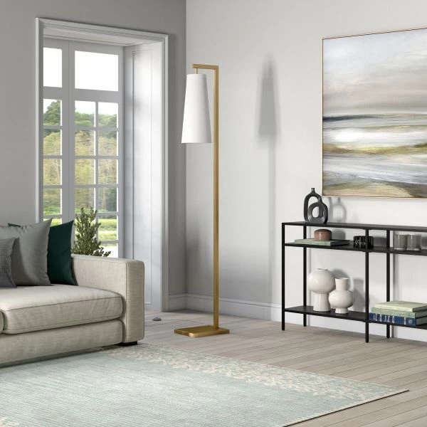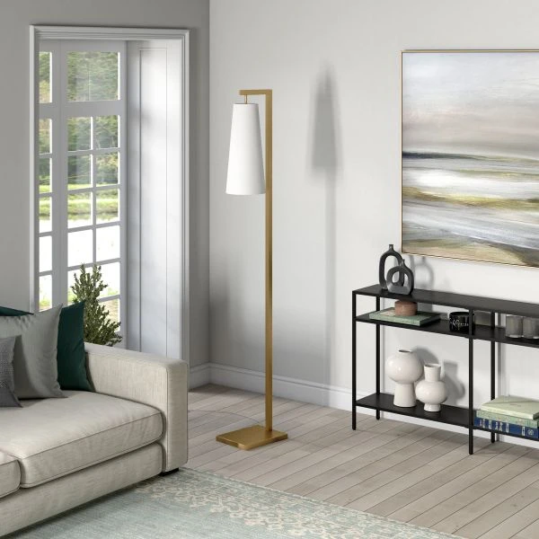 Moser 71″ Tall Floor Lamp with Fabric Shade in Brass/White – Bring an updated Art Deco feel to any room with the eye-catching angles and curves of this retro-inspired but thoroughly modern floor lamp. The gently tapered elongated cone shade in crisp linen casts the perfect amount of ambient light throughout your space. The soft shape of the shade is offset by the angular geometry of its base, creating a contrast that makes a style statement in your bedroom, living room, or den.