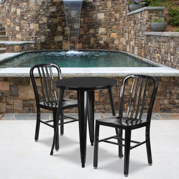 Napoleon Commercial Grade 24″ Round Black Metal Indoor-Outdoor Table Set with 2 Vertical Slat Back Chairs – Complete your dining room, restaurant or patio with this chic table and chair set. This colorful set will add a retro-modern look to your home or eatery. Table features a smooth top and protective rubber floor glides. The industrial style chair features an attractive vertical slat back. This 3 piece table set is designed for indoor and outdoor settings. For longevity, care should be taken to protect from long periods of wet weather. The possibilities are endless with the multitude of environments in which you can use this table, for both commercial and residential spaces.