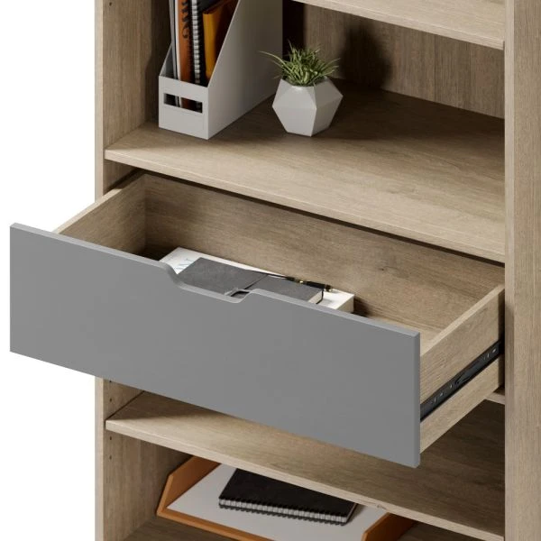 Nashira 61″H 4-Shelf Bookcase With Drawer, Light Oak/Gray – The Nashira 4-shelf bookcase provides the open shelving you need to store and display books, binders and collectibles. The convenient middle drawer makes it easy to store and retrieve supplies, accessories or personal items on this modern bookshelf.