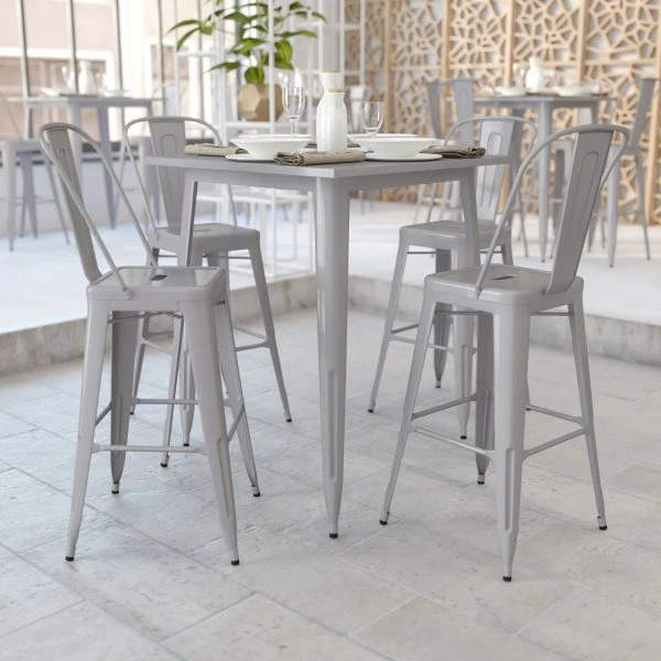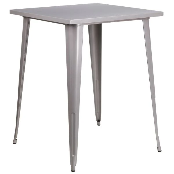 Nolan Commercial Grade 31.5″ Square Silver Metal Indoor-Outdoor Bar Height Table – Create a vibrant, energetic dining space with this colorful industrial style bar height silver metal table. This lively table will add a retro-modern look to your home or business. Pair this table with like colored metal chairs for a uniform look or mix things up by adding different colored chairs. A thick brace underneath the top adds extra stability. The legs have protective rubber floor glides that prevent damage to flooring. This all-weather table is great for indoor and outdoor settings. For longevity, care should be taken to protect from long periods of wet weather. Great for both commercial and residential spaces, the decorating possibilities for this table are only limited by your imagination!