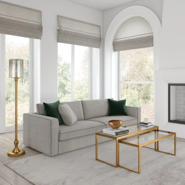 Numit 68.75″ Tall Floor Lamp with Glass Shade in Brass/Mercury Glass – This floor lamp pairs a classic metallic finish with the unique look of silvery mercury glass to evoke understated glamour. The unique finish of the glass shade creates visual interest in any room, while the sleek steel pole fans out in a gentle hourglass shape at the base, drawing the eye and enhancing the verticality of the fixture. This lamp is sure to become a focal point wherever you use it!