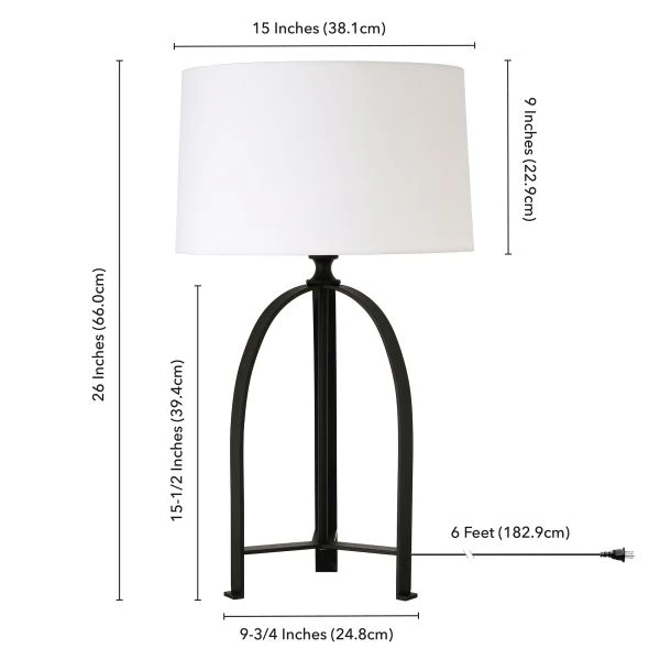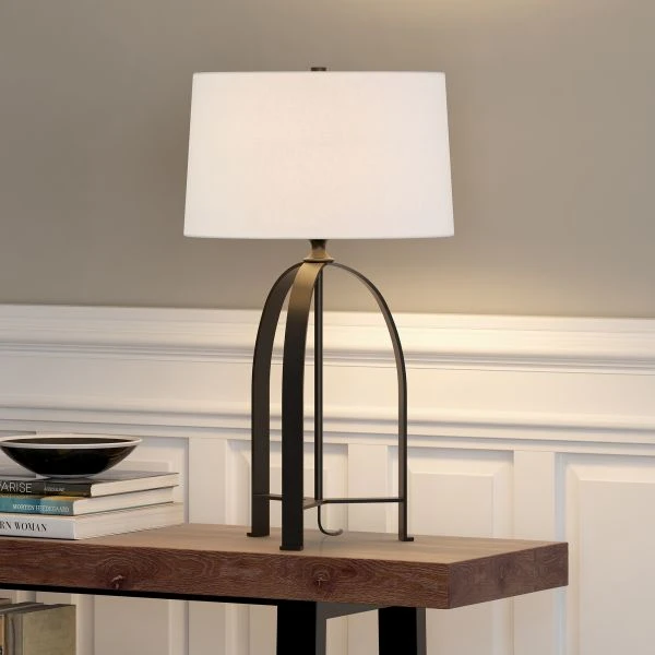 Oakdale 26″ Tall Table Lamp with Fabric Shade in Blackened Bronze/White – Brighten up your modern farmhouse living room or coastal cottage bedroom with this streamlined table lamp. Its gently curved tripod base meets beneath an elegant drum shade, adding a touch of sleek modern style to any space.