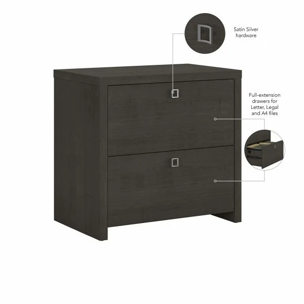 Office by kathy ireland Echo 2 Drawer Lateral File Cabinet in Charcoal Maple – The Office by kathy ireland Echo 2 Drawer Lateral File Cabinet organizes the home or professional space while expressing your uniquely fashionable tastes. Feel inspired by the beautiful blend of an elegant finish and stylish Satin Silver hardware. Designed to make organization easy, the contemporary lateral filing cabinet contains two spacious drawers that open on full-extension ball bearing slides for an effortless reach to letter and legal size documents. The filing cabinet provides an impressively thick, durable surface to create a strong design with a thermally fused laminate finish that resists scratches and stains. The height matches that of any Echo Desk or Credenza (sold separately) to extend the desktop when positioned side-by-side. From Office by kathy ireland and Bush Business Furniture, the 2 Drawer Lateral File Cabinet comes with a 3 Year Manufacturer’s Warranty and meets ANSI/BIFMA quality standards for safety and performance. Browse our full line of contemporary furniture to create an office set you’ll love for years to come. Celebrate your unique style and personality with the Echo Collection.