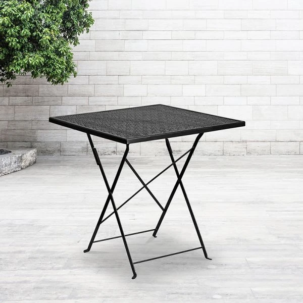 Oia Commercial Grade 28″ Square Black Indoor-Outdoor Steel Folding Patio Table – Brighten up your patio space with this beautiful black folding patio table. The rain flower printed top is very appealing. This table will enhance your bistro, cafe, restaurant, hotel or home patio space. With the convenience of a folding table you can use it as a temporary placement or fold away for storage or cleaning the space. Quickly unfold the table by pulling the center brace. The table was designed for all-weather use making it a great option for indoor and outdoor settings. For longevity, care should be taken to protect from long periods of wet weather.